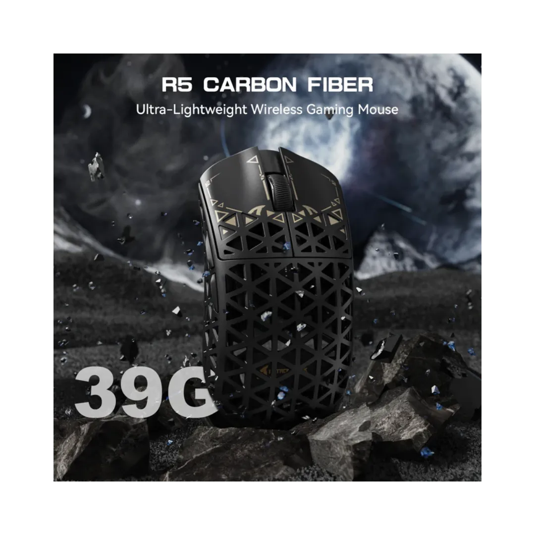 - 39g Carbon Fiber Pro-Grade Durability: ATTACK SHARK R5Ultra mouse crafted with injection-molded carbon fiber and a hollow design, this ultra-lightweight mouse (only 39g) and more durablity. this mouse survives drops and heavy use while delivering featherlight control. Enhanced with DIY anti-slip grips and Teflon feet for personalized glide.