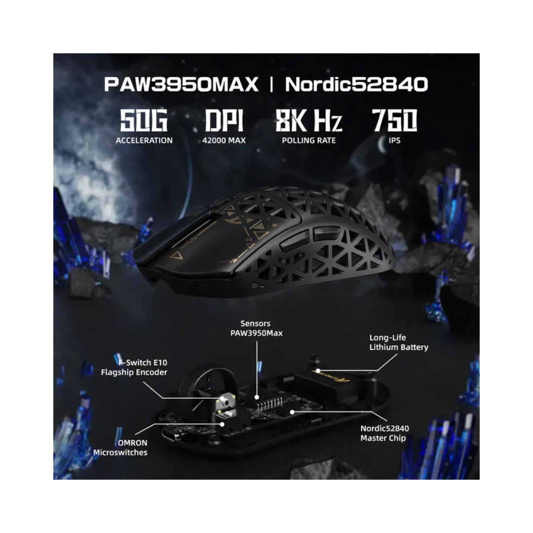 - PAW3950 Flagship Sensor: 42K DPI & 0.125ms Response: Dominate competitive shooters with the PixArt PAW3950 optical engine paired with Nordic 52840 chip: 42,000 DPI precision, 750 IPS tracking, and 8KHz HyperSpeed wireless polling (0.125ms latency vs. standard 1ms). Proprietary anti-jitter algorithms achieve ±0.5% tracking deviation for pixel-perfect headshots in CS2/Valorant and micro-movement control in Apex Legends.