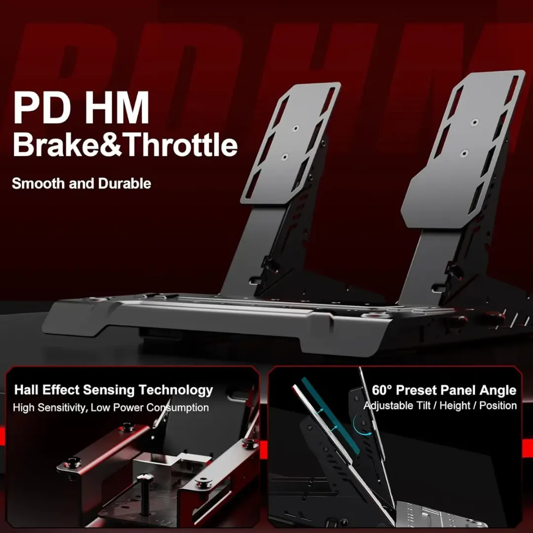 - PD HM Brake&Throttle Hall 2-Pedal: The PD HM PC racing pedal set boasts durable full-metal construction and high-precision Hall-effect sensors for throttle and Brake. Adjustable pedal height and angle offer a tailored driving experience. Its modular design allows for easy disassembly, while the PXN software enables fine-tuned calibration of pedal response curves.