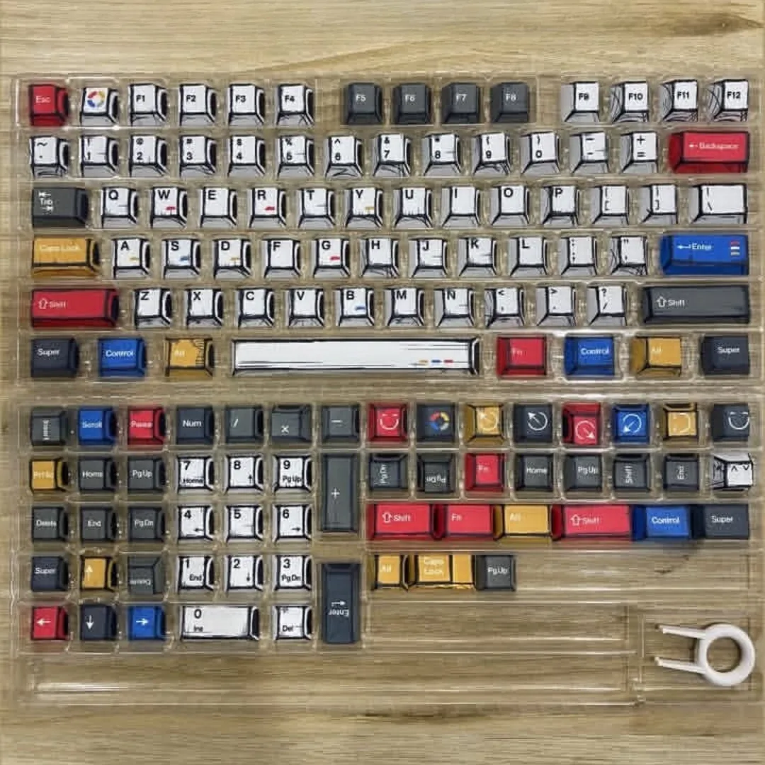 These Comics-style Mechanical Keyboard Keycaps feature a unique hand-drawn, comic-panel aesthetic with bold outlines and vibrant accent colors. The set includes a full 140+ key layout compatible with most mechanical keyboards (including full-size, TKL, and 60–75% boards). The keys come neatly arranged in transparent trays, along with a keycap puller for easy installation.